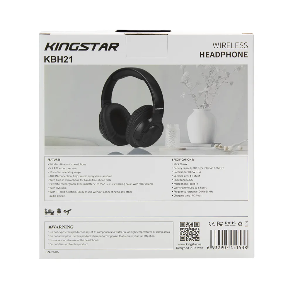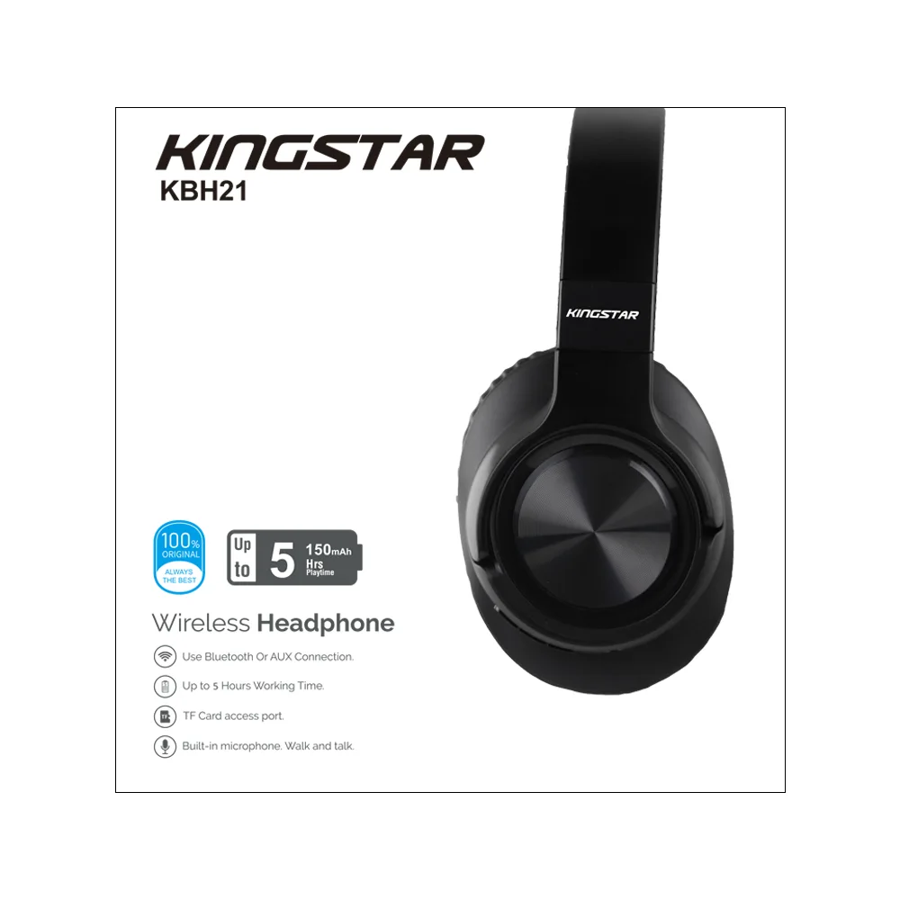 این محصول زیبا و شیک برند کینگ استار با ظرفیت باتری داخلی لیتیوم قابل شارژ 150 میلیآمپر ساعت، یک میکروفون داخلی با قابلیت مکالمه همانند هندزفری را نیز داراست. همچنین زمان پخش موسیقی این محصول با ولتاژ شارژ 3.7 ولت تا 5 ساعت با 50٪ حجم صدا است. هدبند این محصول نیز از جنس پلاستیک ABS میباشد. قابلیت افزایش یا کاهش ارتفاع در این قسمت آن را برای استفاده هر کاربری مناسب میکند. هدفون بلوتوثی کینگ استار مدل KBH21 فرکانس 20 هرتز تا 18 کیلوهرتز را پشتیبانی میکند.