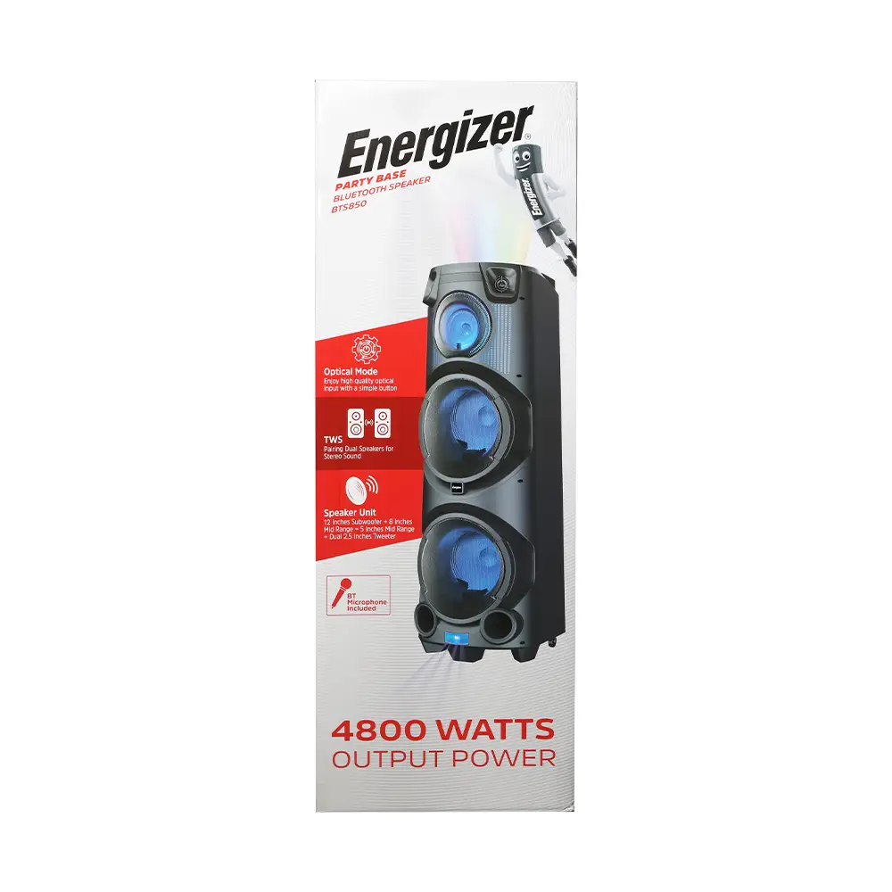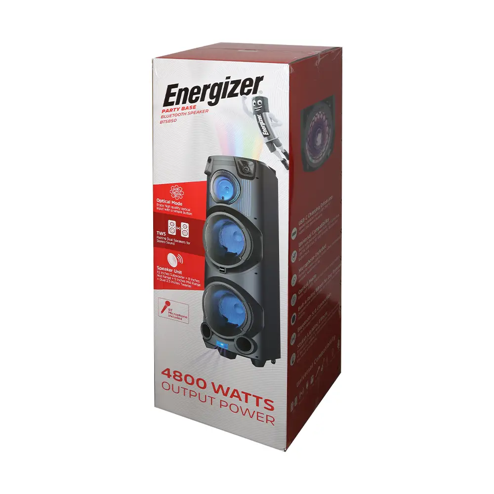 اسپیکر بلوتوثی انرجایزر مدل BTS850 از جدیدترین محصولات پرقدرت و پرطرفدار کمپانی بزرگ انرجایزر است. این هیولای دوست داشتنی، با بیس قوی، تجربهای هیجان انگیز از لذت شنیدن موسیقی را به شما ارائه میدهد. این روزها با توجه به محبوبیت و افزایش تقاضای اسپیکرهای پارتیبوم و پارتی بیس، شرکتهای زیادی به طراحی و تولید این گونه محصولات میپردازند. به همین دلیل اقسام گوناگونی از این محصولات به بازار عرضه شده است. هرکدام از این محصولات شامل ویژگیهای خاصی هستند و برای قشر عمدهی کاربران طراحی و تولید شدهاند.